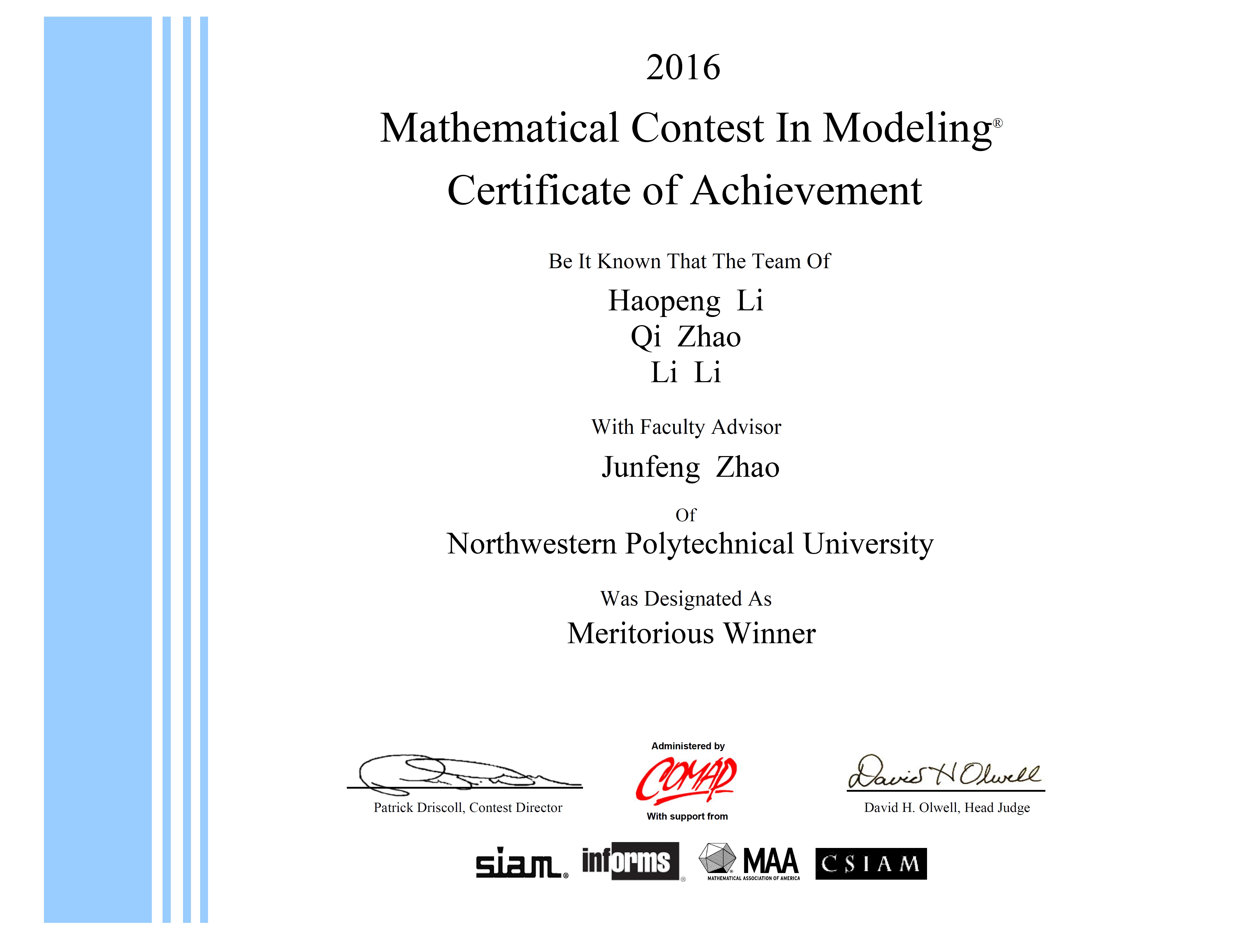 Contests: Meritorious Winner of Mathematical Contest In Modeling (01/2016)